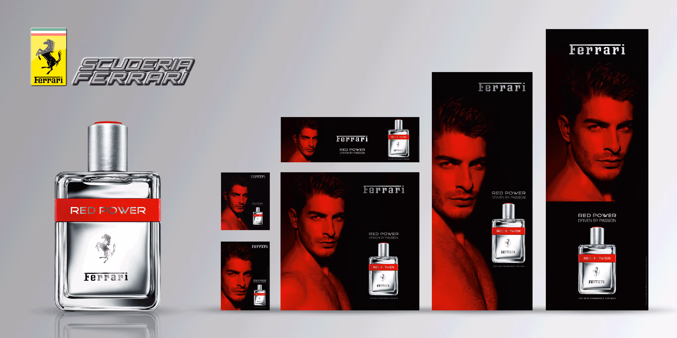 Réalisation d’une campagne d’affichage multi-formats pour le parfum Ferrari Red Power, incluant affiches, bâches