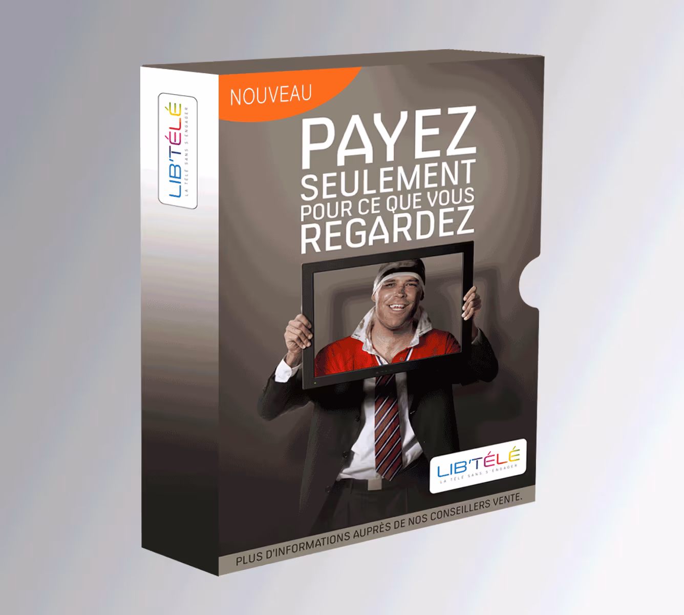 Réalisation de supports de communication visuelle pour Lib'Télé, comprenant conditions générales, coffret produit, kakémonos et brochure commerciale.